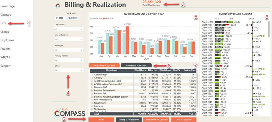 Use the tabs on the top of the visual (8) to view realization by department or by client. In the department view, use the plus signs next to each department to expand and see the