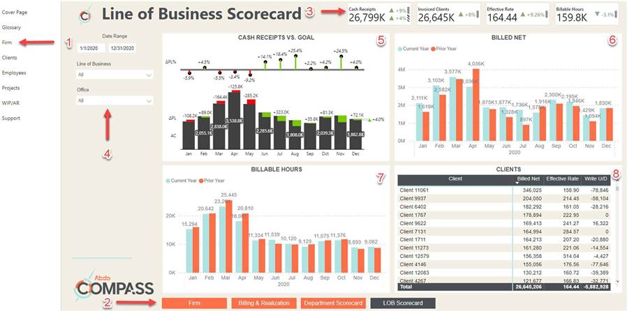 Scorecard, select Firm (1) from the list of pages on the left side of your screen. Once you are in the Firm page, you can use the buttons along the bottom (2) to switch between firm- focused