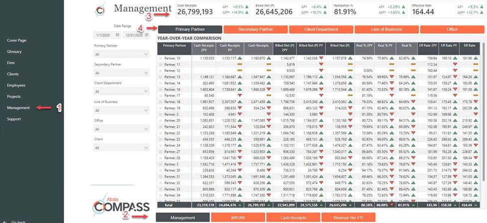 Department Scorecard Purpose The purpose of the Department Scorecard is to show department performance in production and realization. Navigation To navigate to the Department Scorecard, select Firm (1) from the list of pages on the left side of your ...