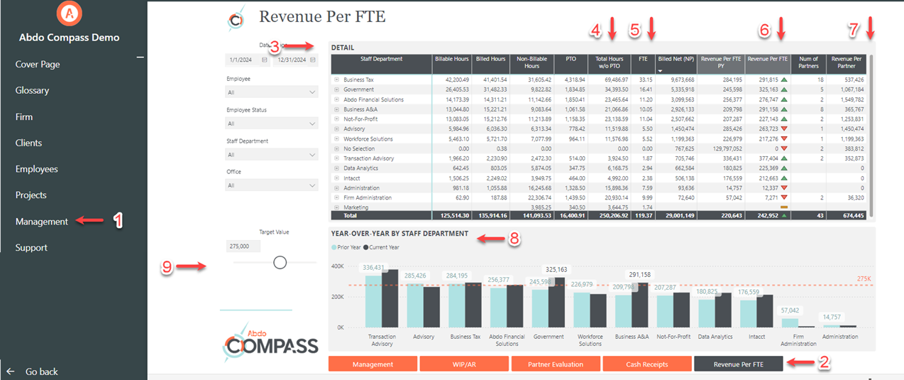 displays each department’s Revenue per FTE for the current and prior year. The dotted